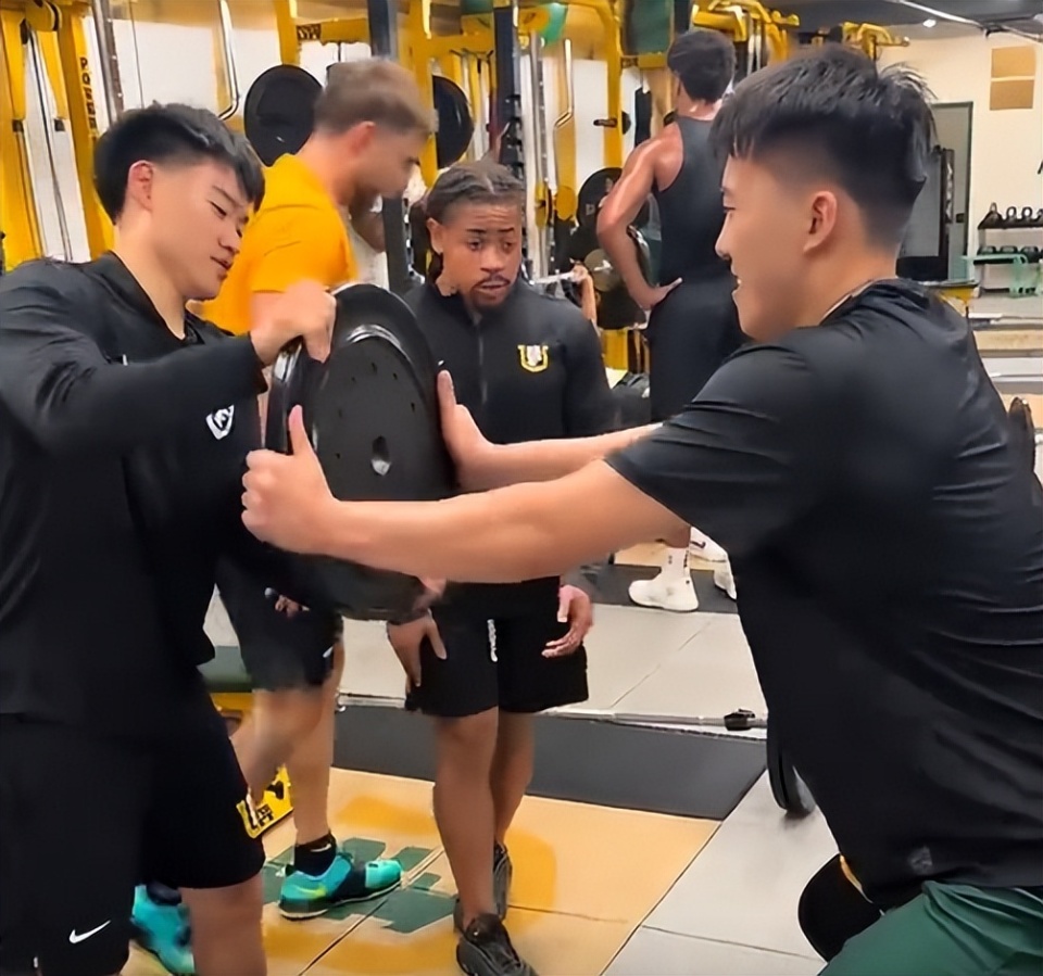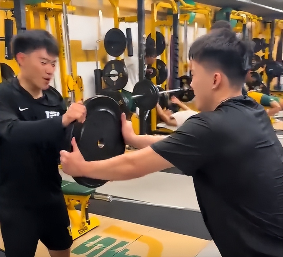 王俊杰还到了健身房进行身体力量训练,他和主教练亲切打招呼,然后进行了卧推训练。王俊杰还在赵维伦的协助下进行核心力量训练。
