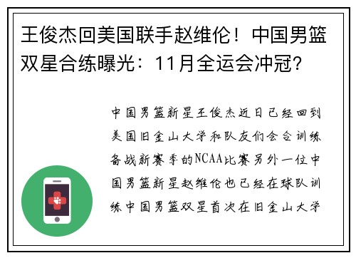 王俊杰回美国联手赵维伦!中国男篮双星合练曝光:11月全运会冲冠?